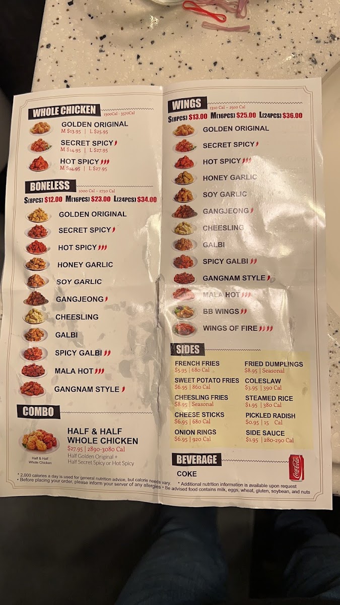 Signature choices like Golden Original and Spicy Whole Chicken highlight a balance between crispy texture and juicy, tender meat. Alongside these, favorites such as soy garlic and honey garlic wings add a subtle sweetness, making them easy to enjoy any time you’re craving something flavorful but not overpowering. The menu also features snacks like pickled radish and classic sides like French fries, supporting a casual, approachable atmosphere where you can savor each bite without fuss.